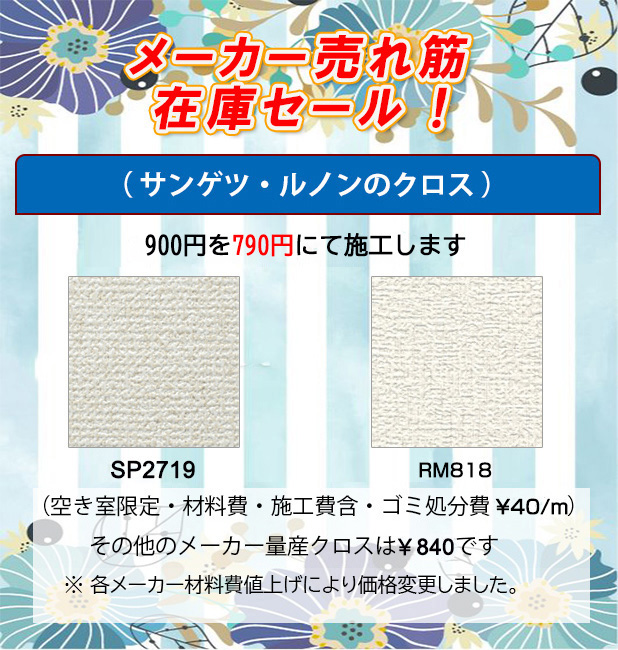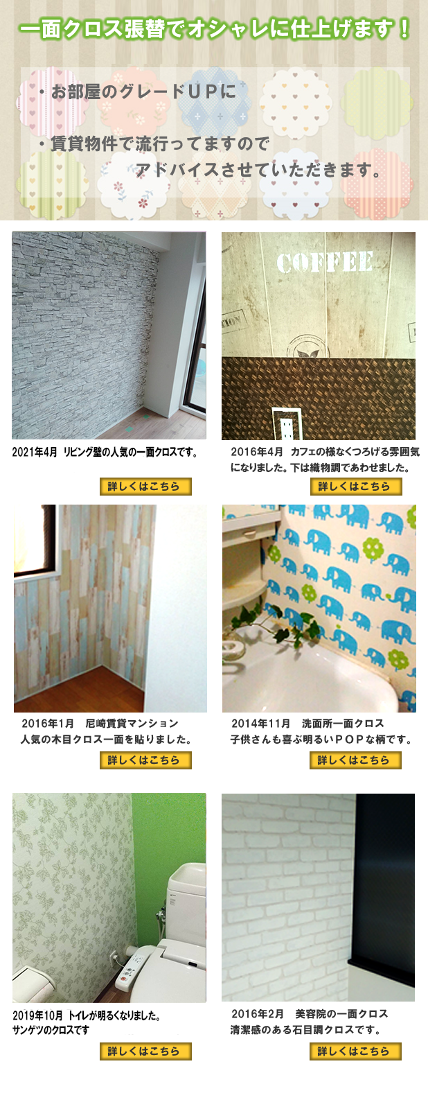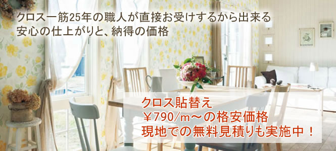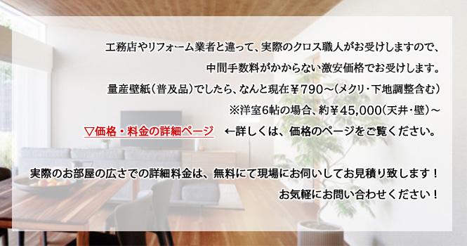 その所を営業だけの経験では、見抜くことはできません。 営業も経験している職人が見積もりにいきますので、 それぞれのお家にあうクロスをアドバイスいたしますので安心して、ご相談下 さい。当社は、経験30年のクロス職人2人でさせていただいてます。(二人の名前をとり、 真実クロス~まことクロスです) よりよい仕事で、お客様に喜んで頂けるよう最善をつくします。是非、お試 しくださ い!