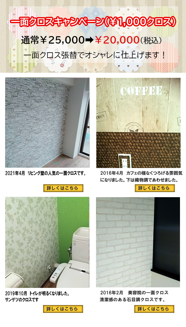 当社はクロス貼りを、メインとして低価格、地域密着業者として施工いたしております。 他社とは 違い、施工する職人が直接、見積もりに伺います。 「現場の状況、クロスの材料によって仕上がりは、 50~70%決まる!」と言っても過言ではありません。 それを見極めないと、仕上がりが悪く、納得のいくリフォームは難しくなりま す。